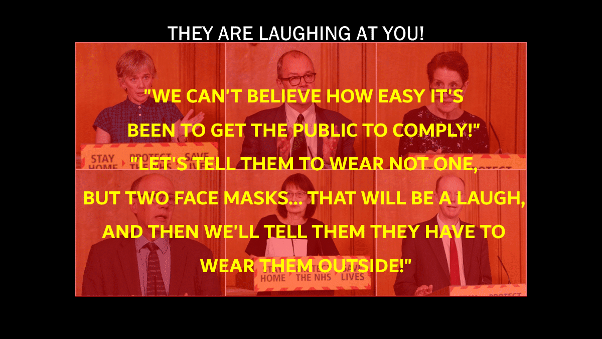 “WE CAN’T BELIEVE HOW EASY IT’S BEEN TO GET THE PUBLIC TO COMPLY!” “LET’S TELL THEM TO WEAR NOT ONE, BUT TWO FACE MASKS… THAT WILL BE A LAUGH, AND THEN WE’LL TELL THEM THEY HAVE TO WEAR THEM OUTSIDE!”