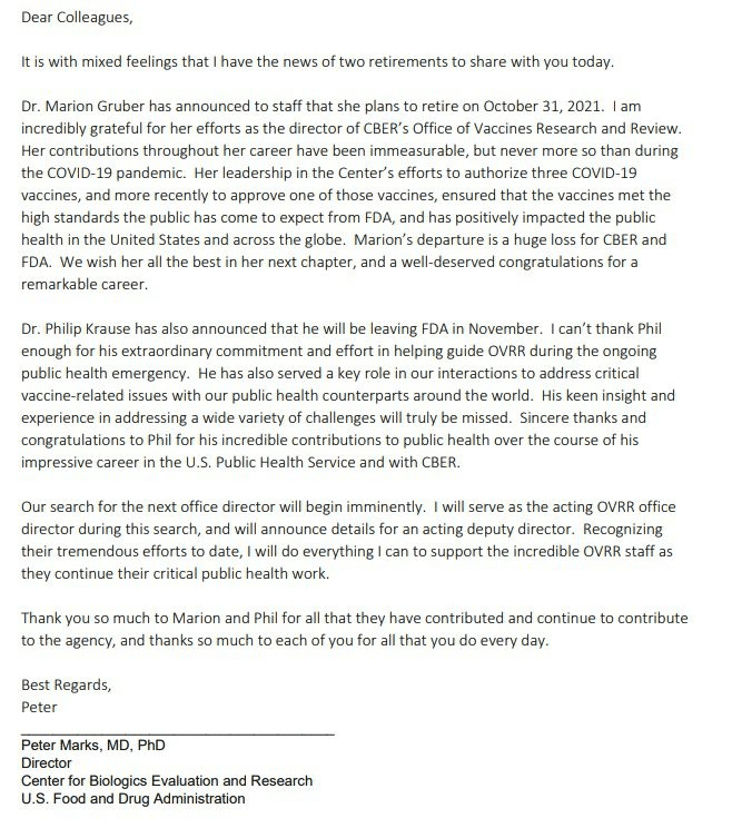 The Director of Centre for Biologics Evaluation and Research sent a letter to FDA staff confirming the resignations in which he wrote that “It is with mixed feelings that I have the news of two retirements… Our search for the next office director will begin imminently”.
