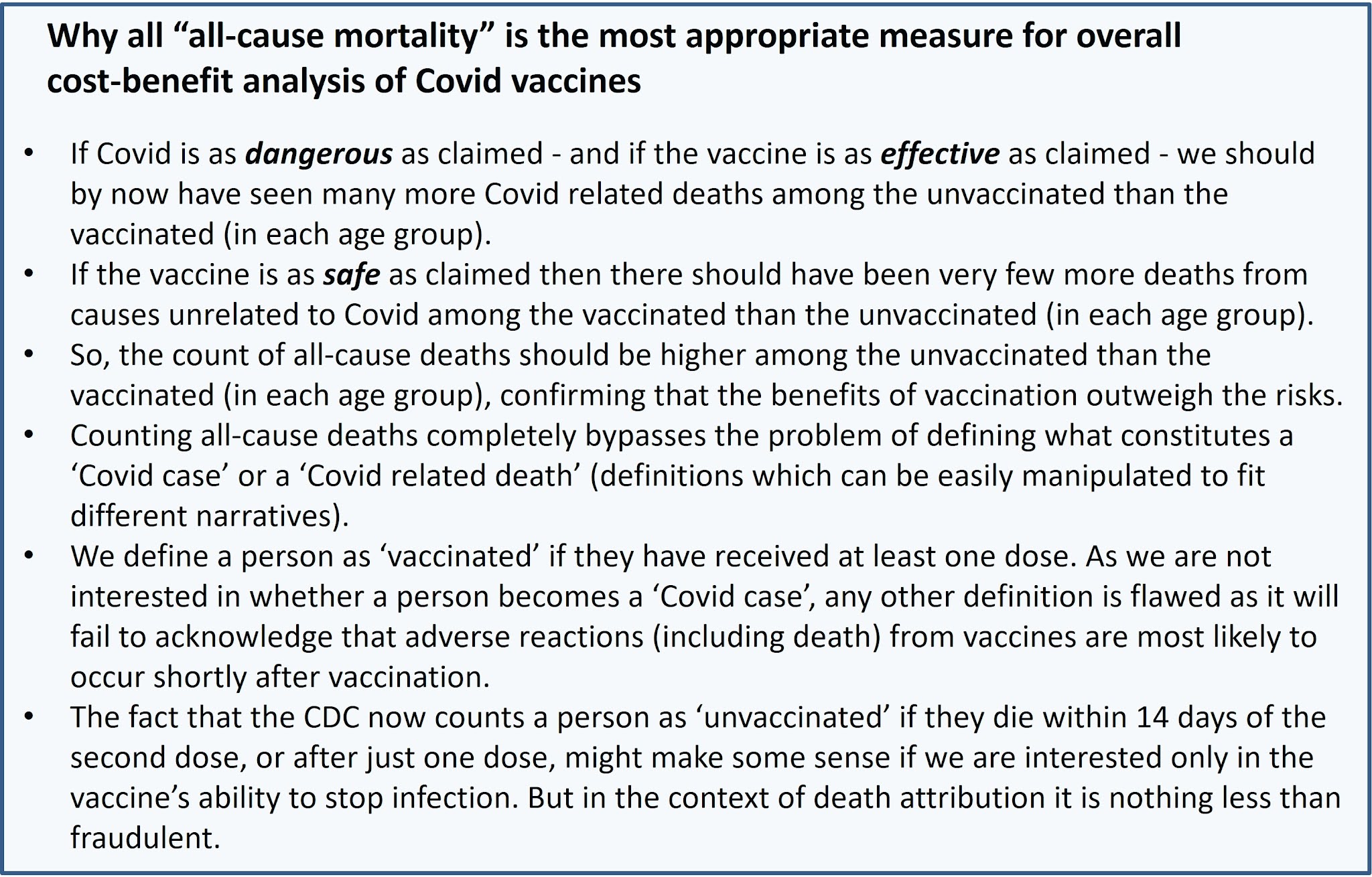 Because of the limitations and possible errors in the ONS data, there are many caveats that need to be applied to our crude analysis. But we can conclude that the ONS’s own data does not support the claims made for vaccine effectiveness/safety.