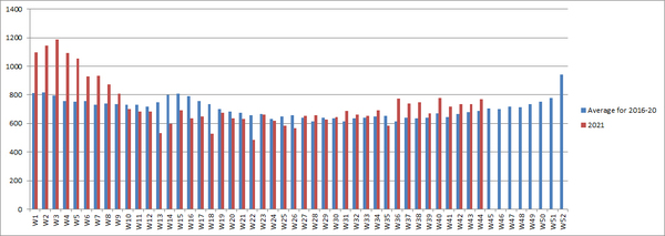 After the jab start date deaths are now 2% below 2020, but 11% above the 5 year average.