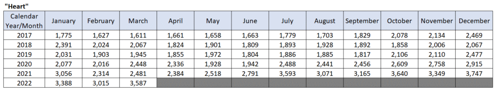 The amount of call outs for patients with heart conditions per year, between 1st January 2017 and present day?
