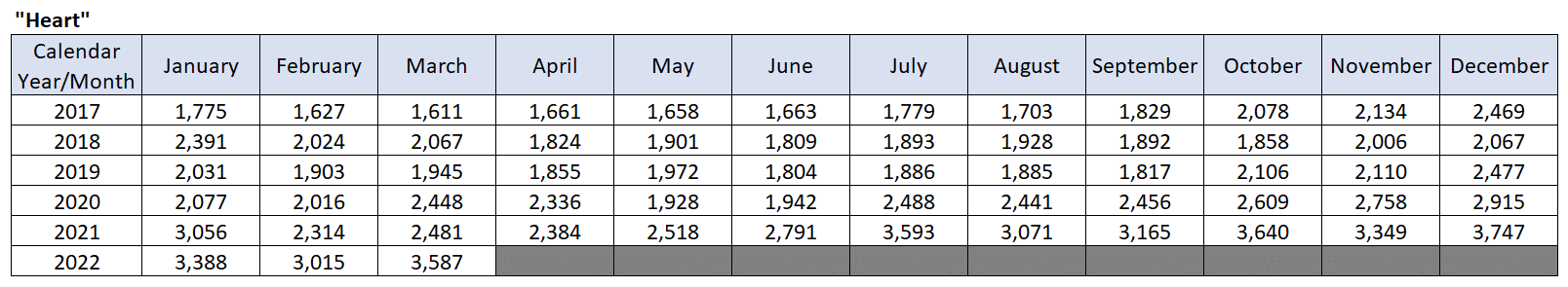 The following table is the one provided by the NHS for the number of overall ambulance call-outs for heart conditions by month and year –
