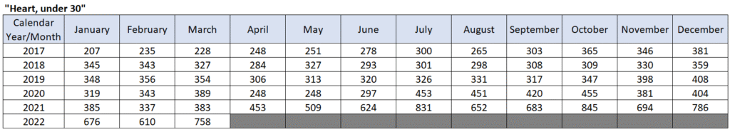 The following table is the one provided by the NHS for the number of ambulance call-outs for heart conditions among people under the age of 30 by month and year –
