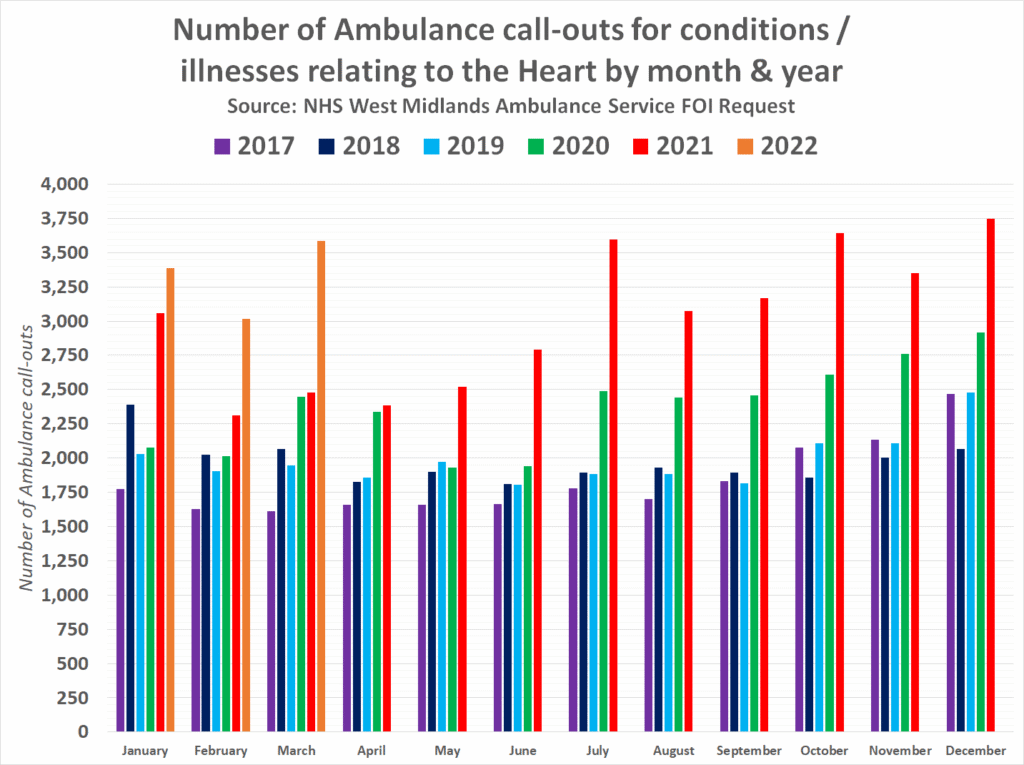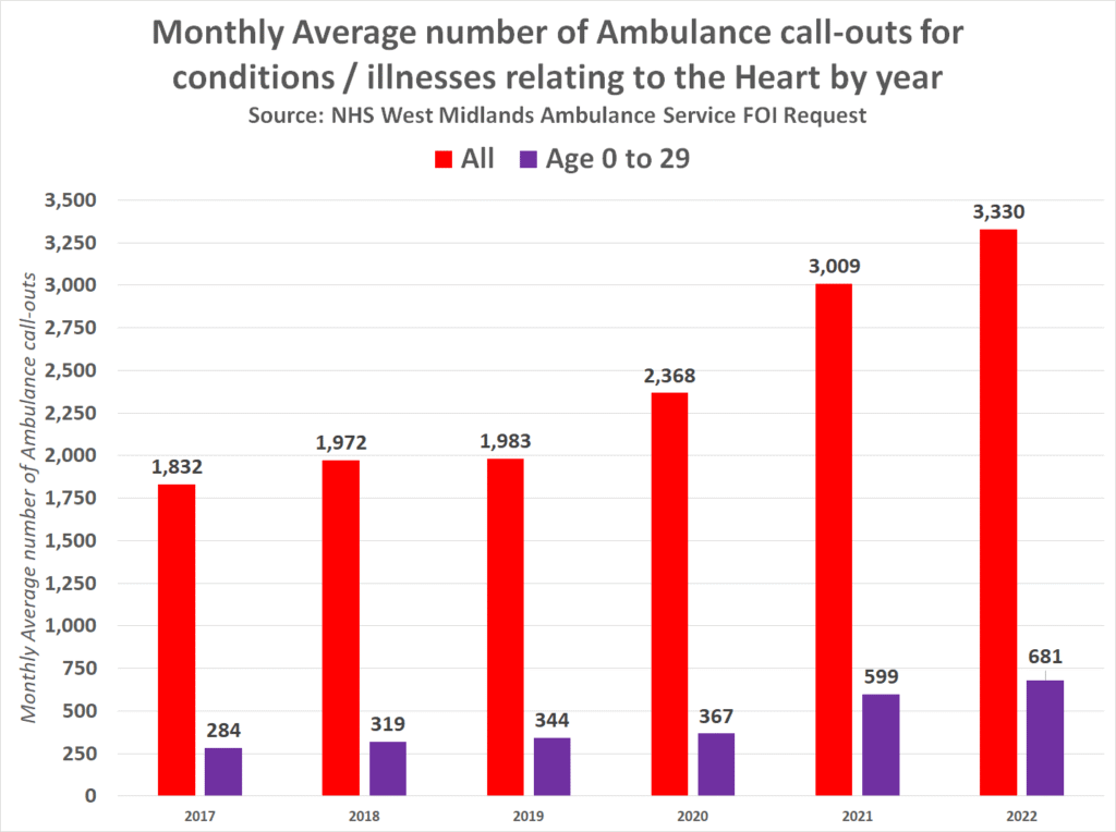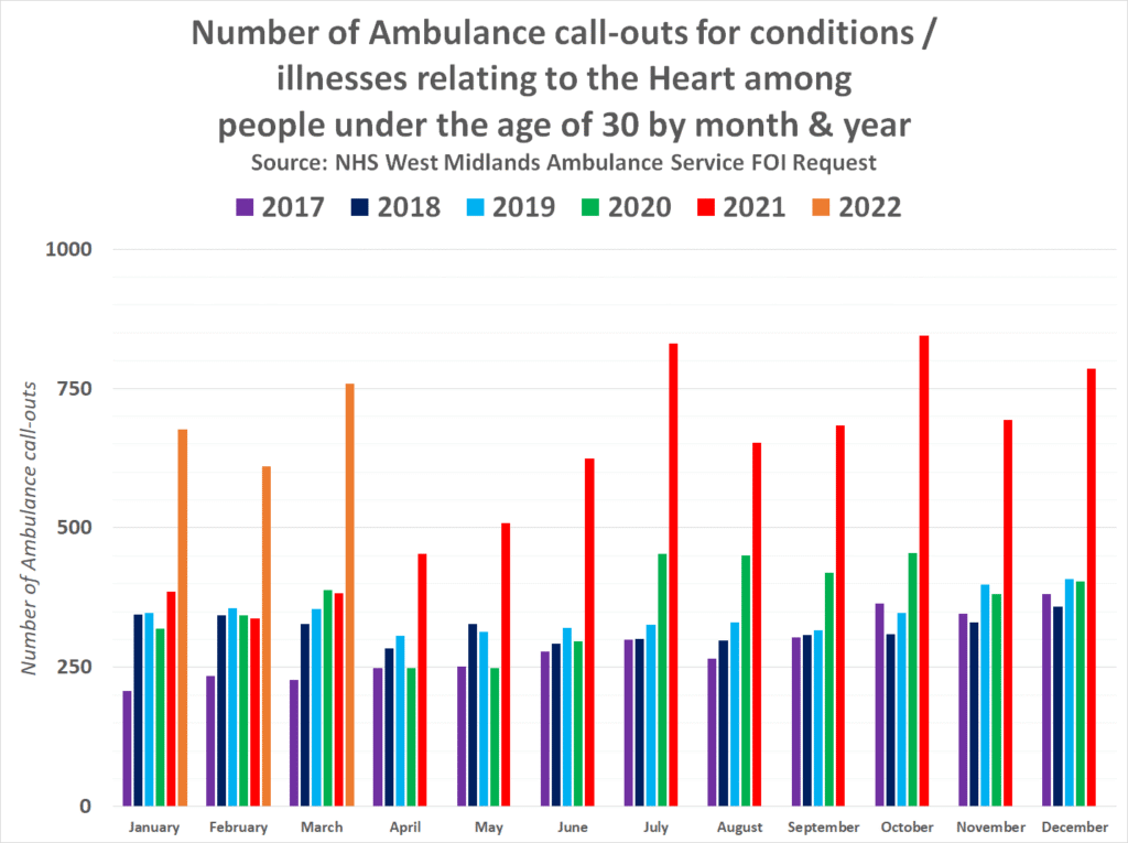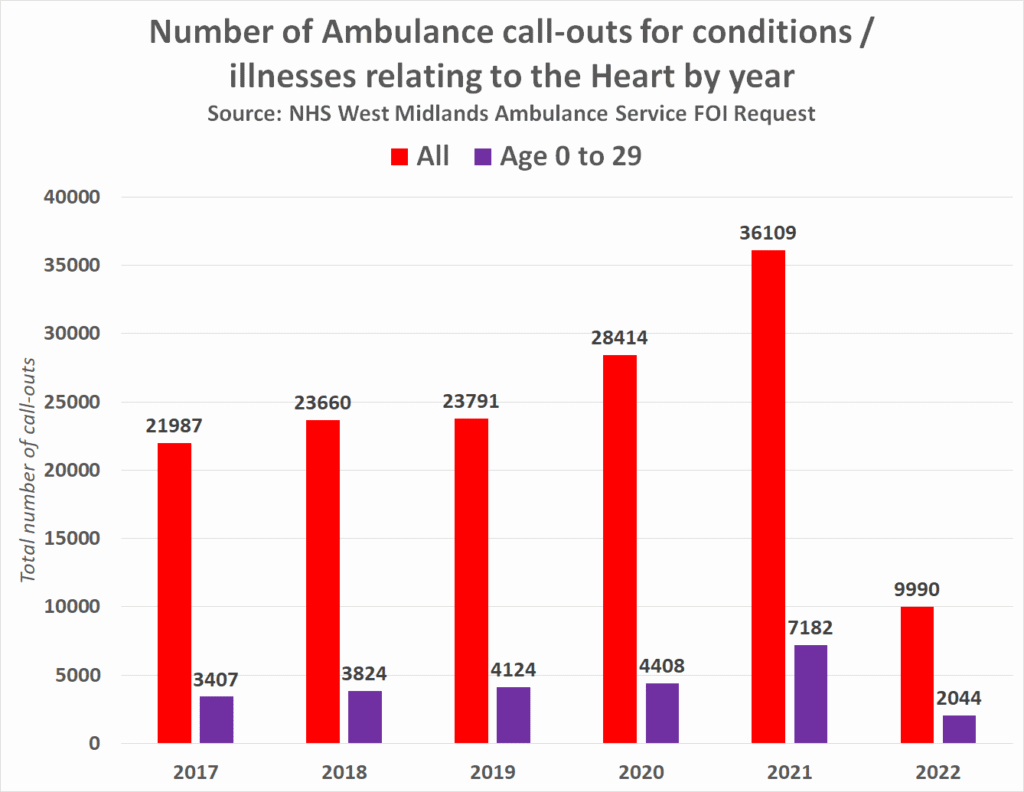 The National Health Service has confirmed in response to a freedom of information request that ambulance call-outs relating to immediate care required for a debilitating condition affecting the heart nearly doubled in the whole of 2021 and are still on the rise further in 2022. But the most concerning published figures show that they have also doubled among people under the age of 30.