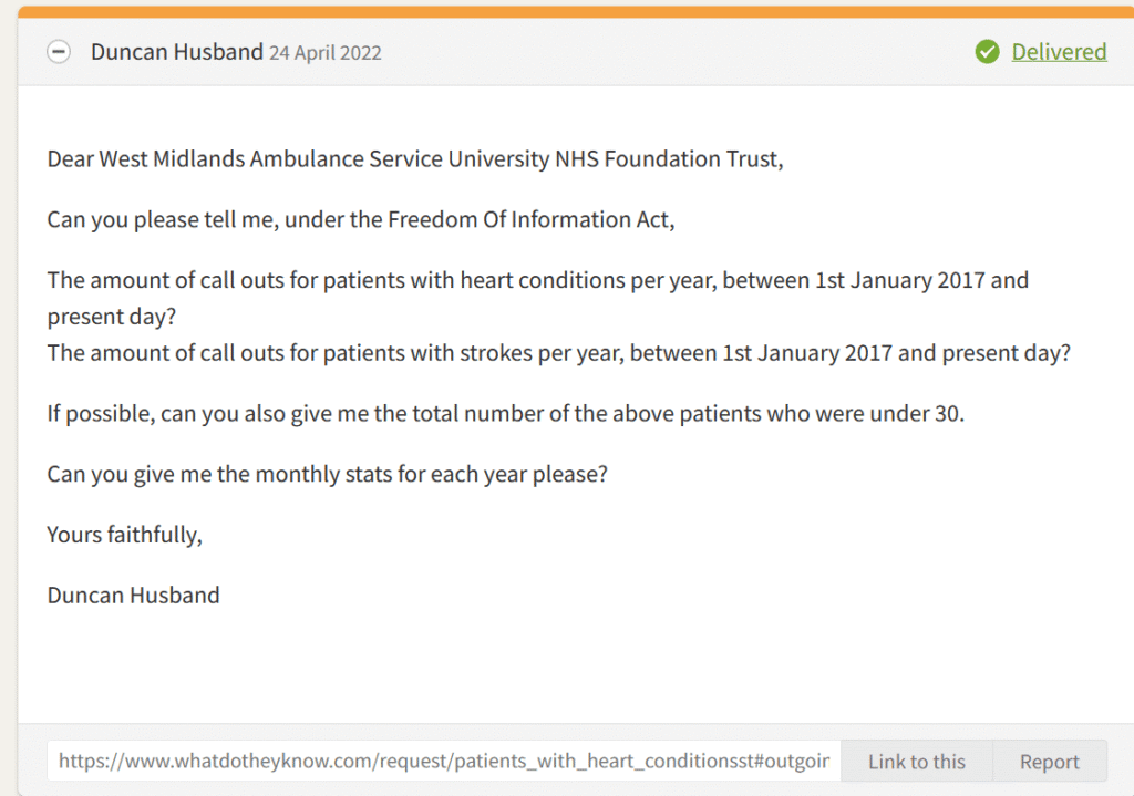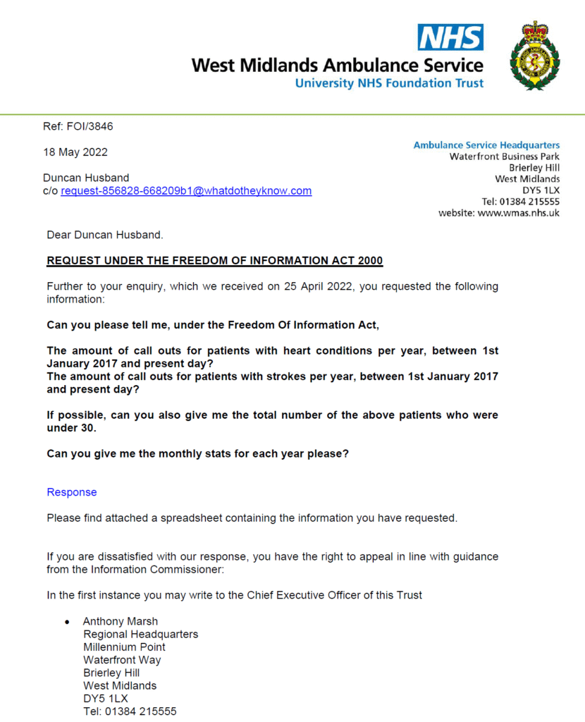 On the 25th April 2022, Duncan Husband sent a Freedom of Information (FOI) request to the West Midlands Ambulance Service University NHS Foundation trust requesting to know the following –