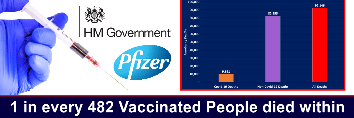 Please share our story! Print 🖨 PDF 📄The UK Government has revealed that 1 in every 482 people vaccinated against Covid-19 in England sadly died within a month of receiving a dose … Continue reading 1 in every 482 Vaccinated People died within 1 Month of Covid-19 Vaccination in England according to the UK Government
