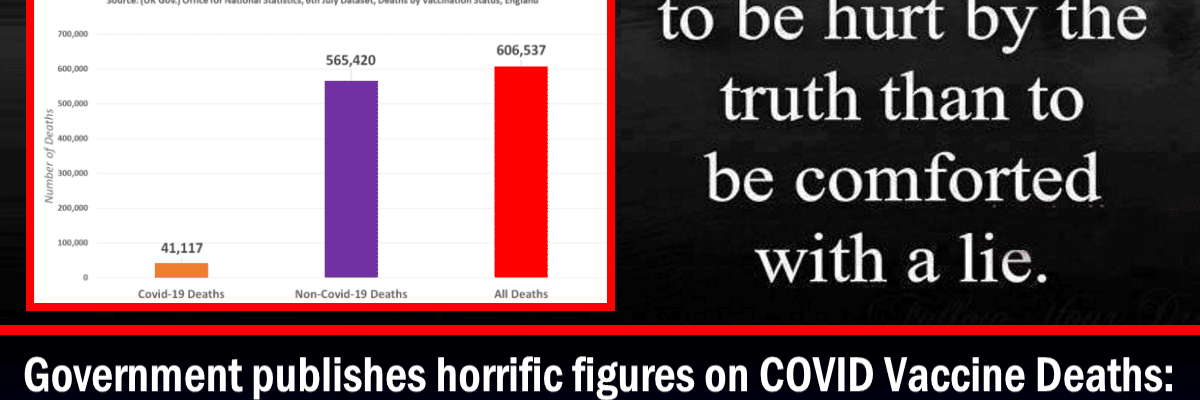Please share our story! Print 🖨 PDF 📄The UK Government has published official figures on deaths following Covid-19 vaccination and they reveal that 1 in every 482 Covid-19 vaccinated people in England … Continue reading Government publishes horrific figures on COVID Vaccine Deaths: 1 in 482 dead within a month, 1 in 246 dead within 60 days, & 1 in 73 dead by May 2022
