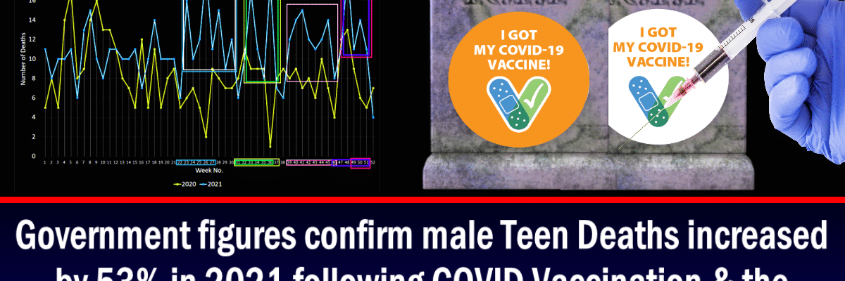 Please share our story! Print 🖨 PDF 📄An investigation of UK Government data has revealed that there was a 53% increase in deaths deaths due to all causes among male teens aged … Continue reading Government figures confirm male Teen Deaths increased by 53% in 2021 following COVID Vaccination & the Death spikes correlate with the uptake of each dose