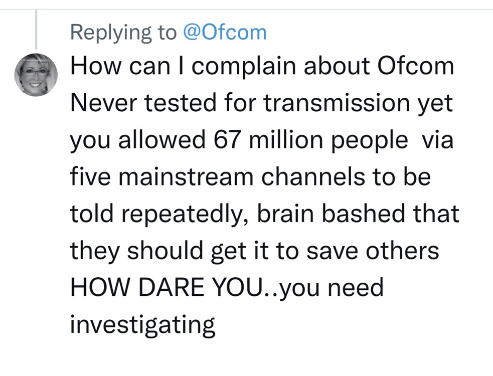 Kathy Parr tweeted: Ofcom should be investigating Dr Sara Kayat – she’s the one who spread misleading and harmful information on “This Morning” – aka utter lies. [See article in The Sun: This Morning hit by Ofcom complaints after Dr Sara claims Covid vaccine is ‘100% effective’ against death.]