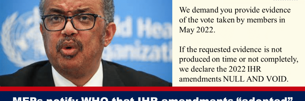 Please share our story! Print 🖨 PDF 📄12 Members of the European Parliament (“MEPs”) wrote to the World Health Organisation demanding “conclusive and unambiguous evidence” that International Health Regulations (“IHR”) amendments “adopted” … Continue reading MEPs notify WHO that IHR amendments “adopted” in 2022 are null and void in the absence of evidence of a vote having taken place