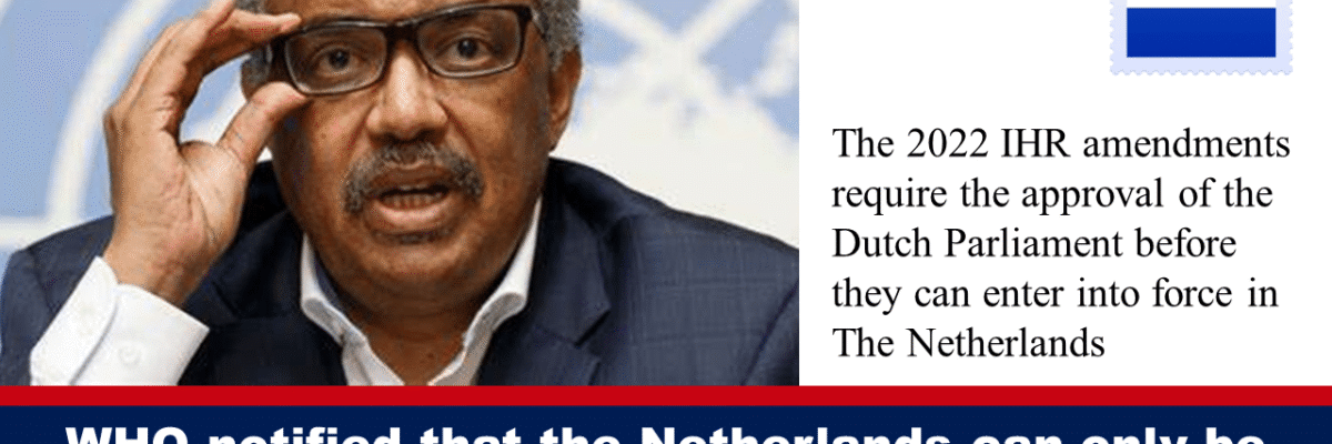 Please share our story! Print 🖨 PDF 📄On Tuesday, Member of the Netherlands Parliament Wybren van Haga wrote to the World Health Organisation’s (“WHO’s”) Director-General, Dr. Tedros Adhanom Ghebreyesus, to inform him … Continue reading WHO notified that the Netherlands can only be bound by IHR amendments after approval by Parliament, and that hasn’t happened