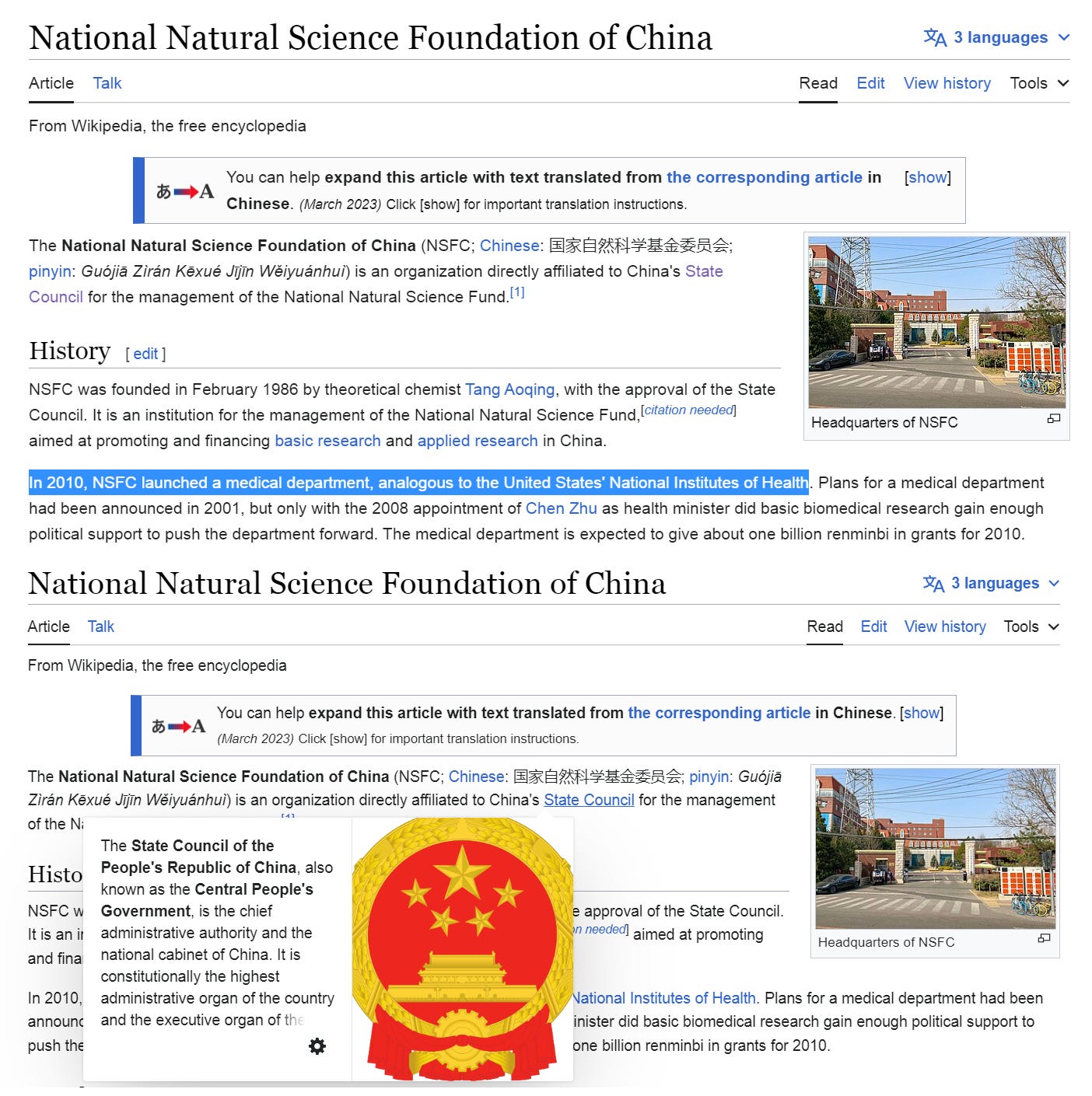 • “National Natural Science Foundation of China” is the equivalent of the NIH in the US and is “directly affiliated to China’s State Council” – The Chinese Communist Party / Government.