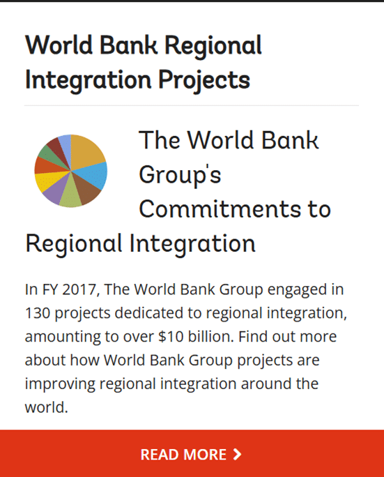 Nevertheless, in 2017, the World Bank Group was engaged in 130 projects dedicated to regional integration.