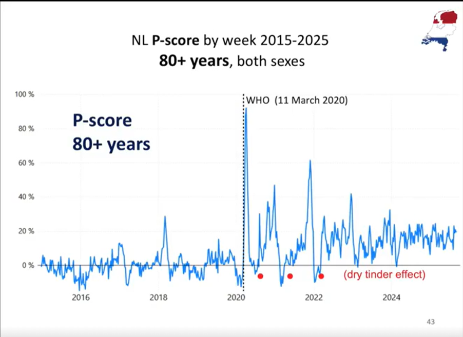 Showing a graph of weekly P-scores from 2015 to 2025 for 80+ year olds in the Netherlands, Rancourt said, “that is evidence that these large peaks are accelerated deaths of the elderly. They would have died later in the coming weeks and months, but they don’t. So compared to the historic trend, you go negative [see red dots in image below]. So that’s a demonstration of abuse and of something that’s happening that is directly targeting these individuals.”
