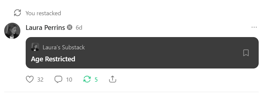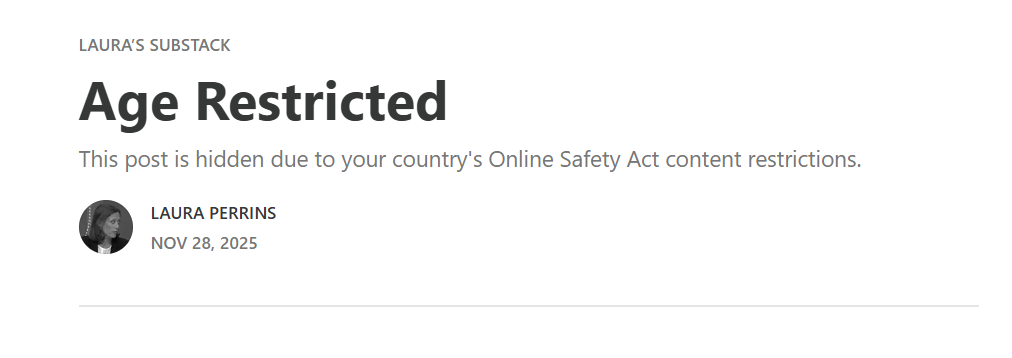 Also, previously re-Stacked articles have been blocked. For example, THIS article by Laura Perrins. People in the UK who refuse to comply and verify their age can no longer view even the title or image of an article: