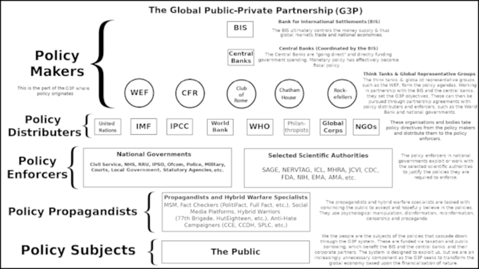 Here in the UK we live in the UK branch – a kind of franchise – of the global public-private partnership (“G3P” also known as “GPPP”), an international network controlled and engineered by oligarchs. The “UK state” is one among many G3P regional bureaucracies that we call nations. The Kakistocrats – the government – get their marching order from the G3P they serve.