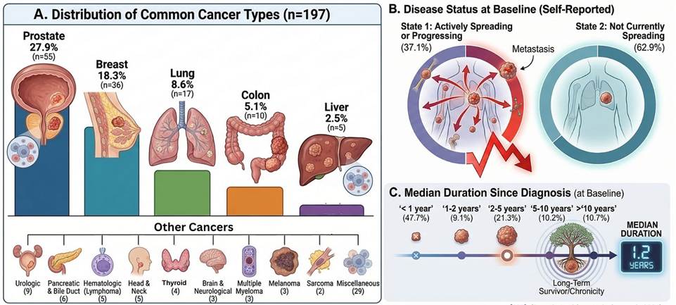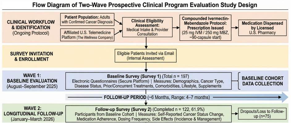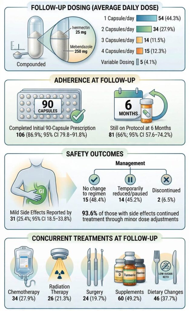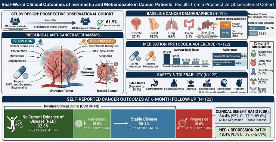 We analysed a prospective observational cohort of 197 cancer patients, with 122 completing structured follow-up at approximately six months (61.9% response rate). Patients were prescribed a compounded ivermectin–mebendazole protocol by licensed US providers, and outcomes were collected through standardised digital surveys assessing cancer status, adherence and safety.