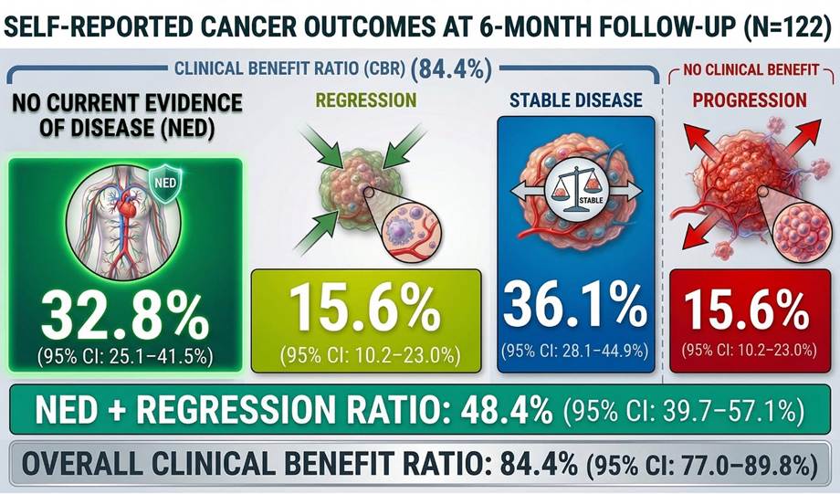 At approximately six months post-treatment initiation,we observed an 84.4% Clinical Benefit Ratio (“CBR”), with nearly half of cancer patients (48.4%) reporting either no evidence of disease (32.8%) or tumour regression (15.6%).An additional 36.1% reported disease stabilisation. This means more than four out of five patients reported either improvement or stabilisation of their cancer.